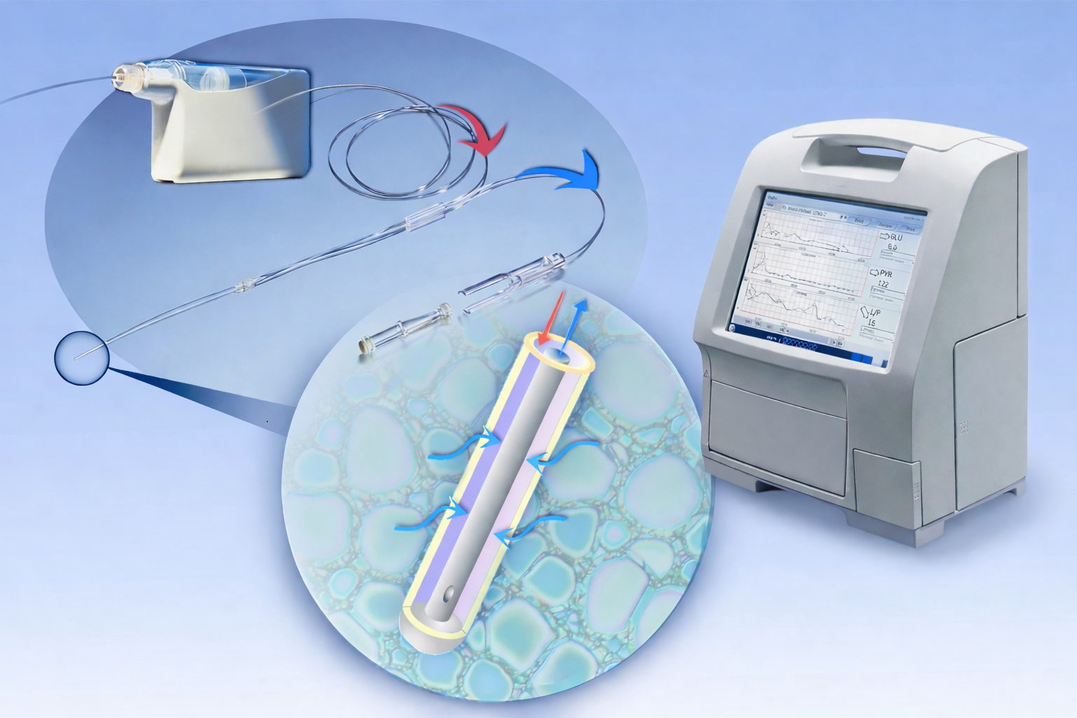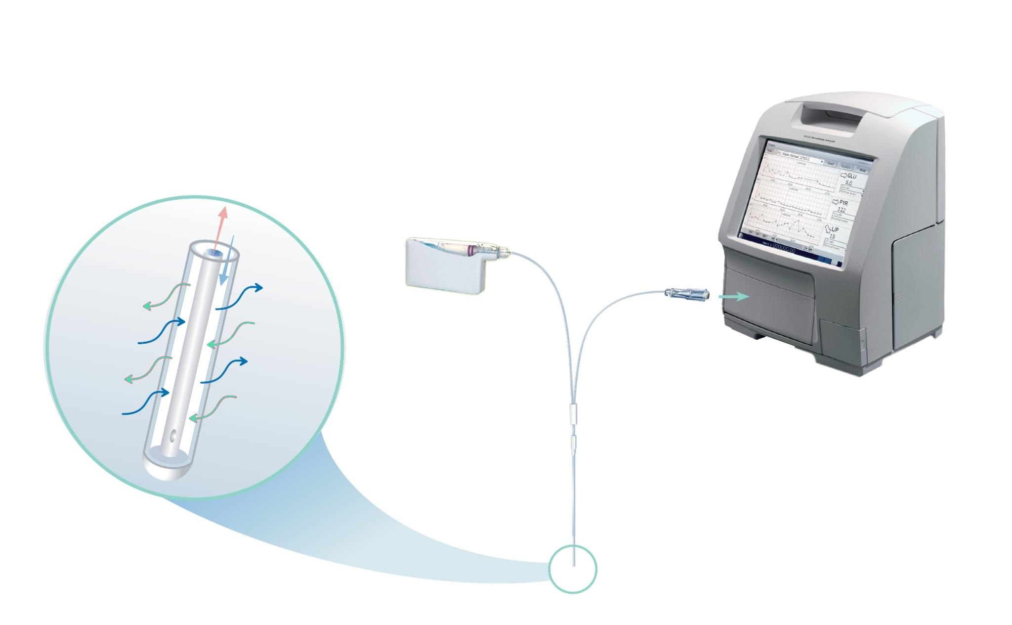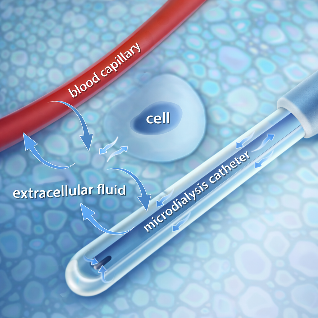 The Microdialysis Catheter mimics a “blood capillary”. There is an exchange of substances