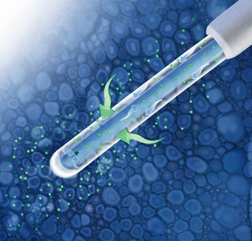 are carried out of the catheter by a flow of Perfusion Fluid to a microvial.